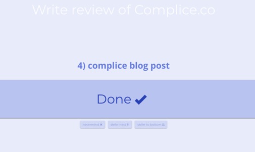 Complice isn’t shiny and it’s not built to serve as the collection box for all the items on our ever-growing list of things we must do. It’s a tool that was solely built to help us make tiny bits of progress towards our far-reaching goals on a daily basis.