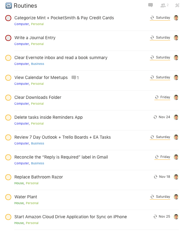 The colored texts below the task, such as “House” and “Personal,” are labels that allow you to group similar tasks together. In my routine, I’ll assign a recurring item as either being something I accomplish on my “Computer” or my “House” if I need to be physically present. Then I’ll label it as either relating to my “Personal” self or the “Business.”